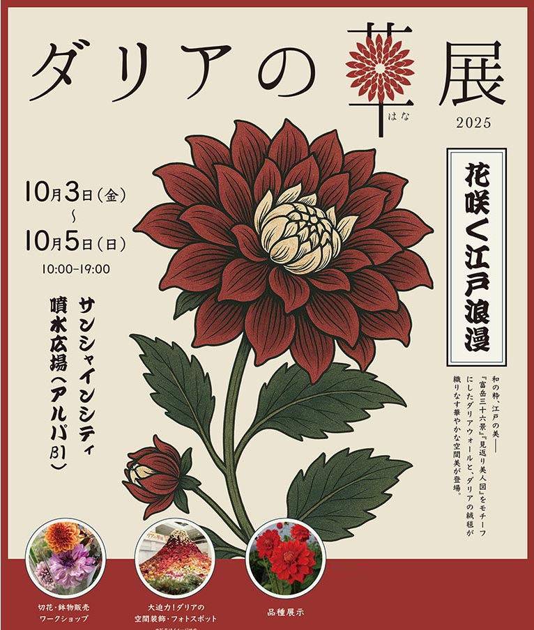 ![]() サンシャインシティ(東京・池袋)では、10月3日(金)~ 10月5日(日)の3日間、ダリアの魅力を様々な角度からご紹介する「ダリアの華展2025」をサンシャインシティ 噴水広場(専門店街アルパB1)で開催します。 今回で15回目を迎える本イベントでは、“花咲く江戸浪漫”をテーマに、和の粋、江戸の美をダリアで表現し、 『富岳三十六景』や『見返り美人図』などの日本の有名な浮世絵美術作品をモチーフにした特別装飾やダリアの絨毯フォトスポットが登場。様々なダリアが一堂に会した会場では、ダリアの色・花型・大きさの豊富なバリエーションを思う存分に感じていただけます。また、会場ではダリアの切花・鉢物の販売を行います。その他、マミフラワーデザインスクール校長/考花学者(花文化・美学研究)川崎景介氏によるトークショーなど、ダリアをより一層知って楽しむことができます。この機会に是非、彩り豊かなダリアの世界をお楽しみください。 |